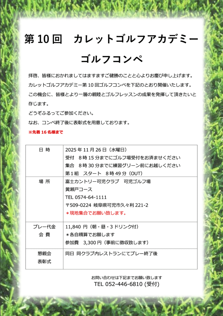 11/16(日)に開催予定をしておりましたカレットゴルフアカデミーゴルフコンペですが、日程や場所が変更となりました💦 すでにご予定を入れてくださっていたり、ご検討してくださっておりました会員の皆様には、ご迷惑をおかけし大変申し訳ございません🙇♀️