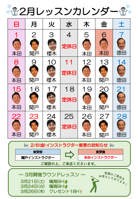 こんにちは😊 徳重店の青山です⛳️ 2月のレッスンカレンダーができあがりました🗓✨️ インストラクターの変更がございます⚠️⚠️⚠️ 2/3(火) 成田インストラクター → 平田インストラクタ…