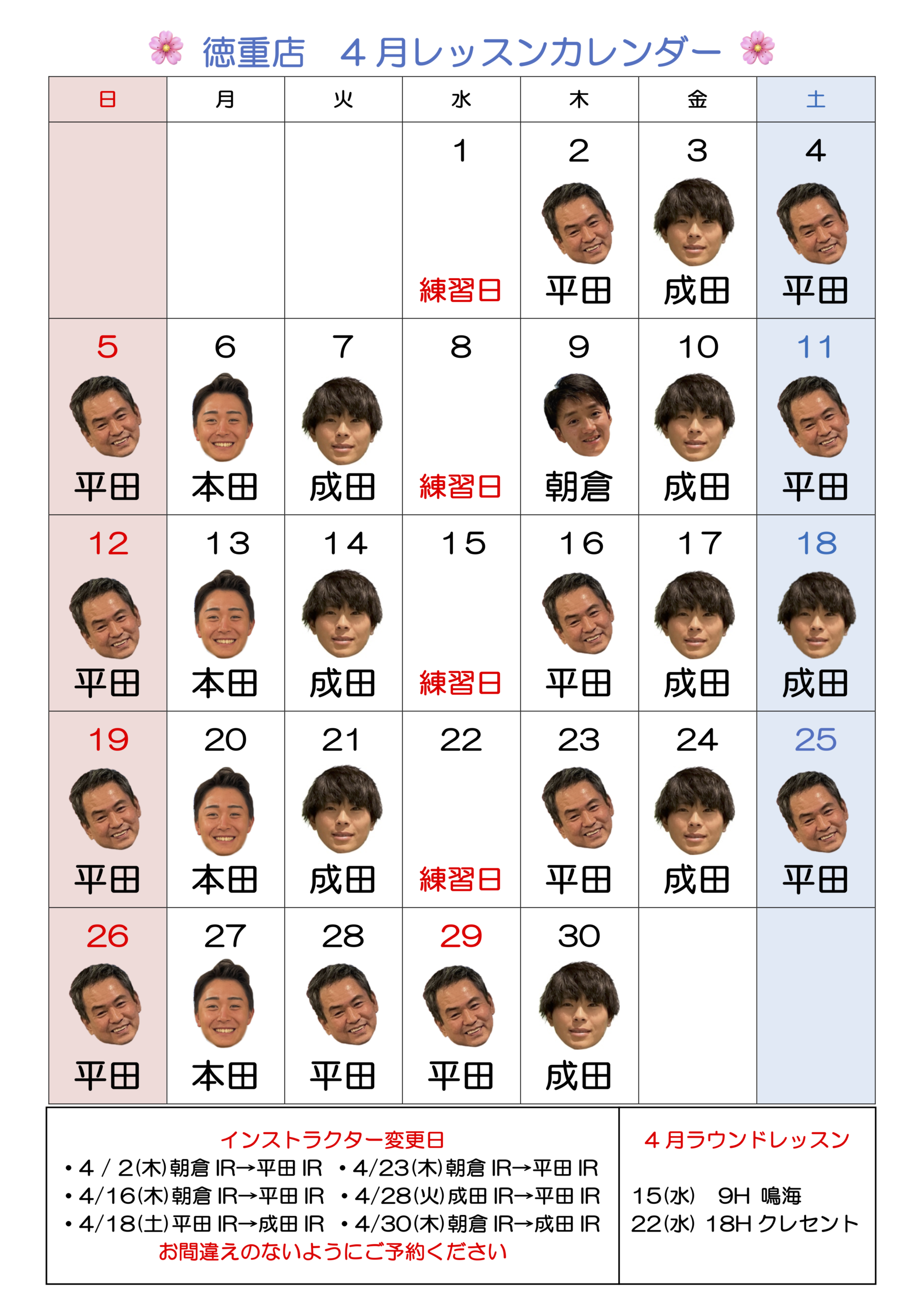 いつもありがとうございます☺️徳重店の松本です。 4月のレッスンカレンダーをお知らせいたします🗓️ インストラクターの変更日がございますので、確認の上、ご予約をお取りくださいませ⛳️ もうすぐ…